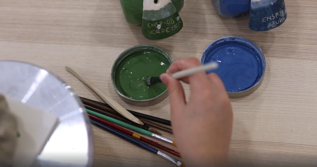 “Glazuur is eigenlijk een glanzende laag die na het stoken op je scherf kun je aanbrengen. Dat kan door kwasten, dompelen of spuiten. En in die stook verandert die poederlaag in een glaslaag. Dan krijg je een mooie glanslaag op je werk.”