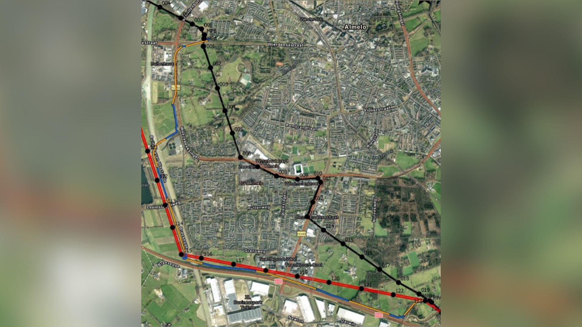Hieronder is het nieuwe (ondergrondse) tracé weergegeven met een blauw/gele lijn. Het te verwijderen tracé is met de zwarte lijn weergegeven tussen Almelo Mosterdpot aan de Wierdensestraat en Almelo Tusveld aan de Maatkampsweg.