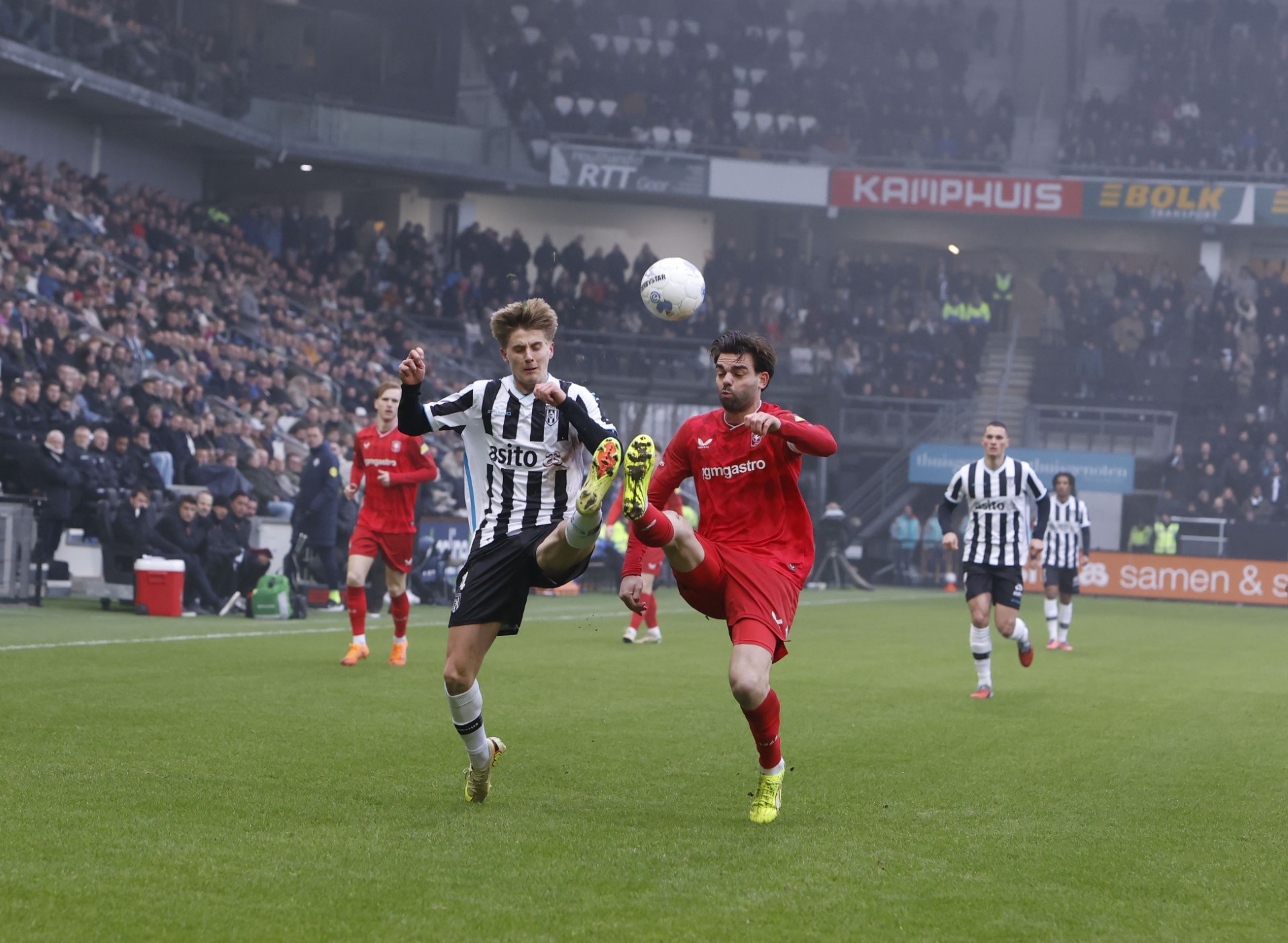 De derby begon zoals verwacht: fel, strijdlustig en met veel spanning op de tribunes. FC Twente had in de openingsfase iets meer controle aan de bal, terwijl Heracles probeerde gevaar te stichten via de omschakeling. Grote kansen bleven aanvankelijk uit, al moest doelman Twan Jansink een paar keer alert zijn bij Twentse pogingen van afstand.