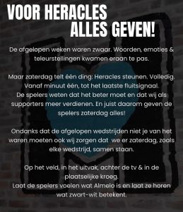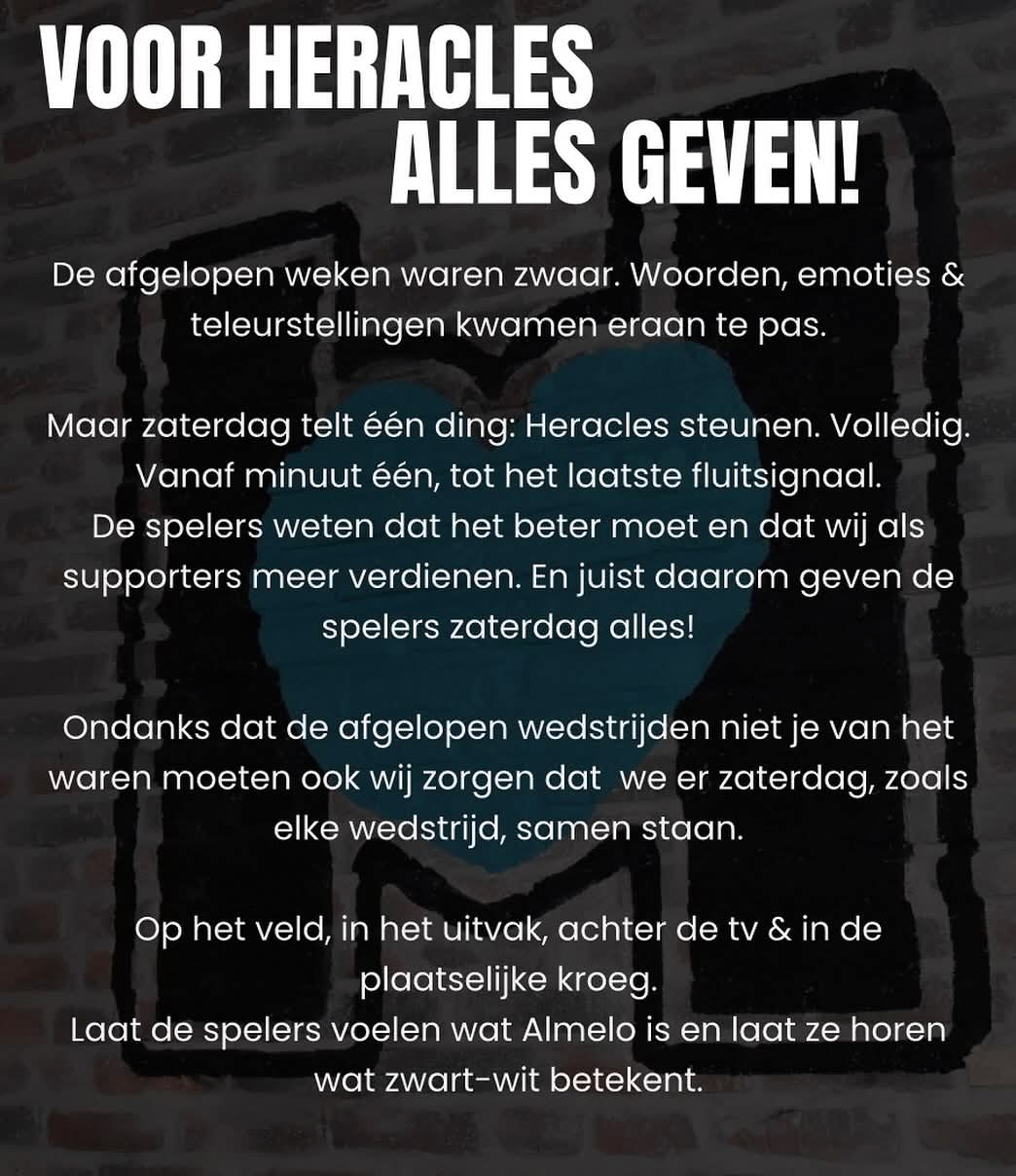“De afgelopen weken waren zwaar. Woorden, emoties en teleurstellingen kwamen eraan te pas”, zo valt te lezen. “Maar zaterdag telt één ding: Heracles steunen. Volledig. Vanaf minuut één, tot het laatste fluitsignaal. De spelers weten dat het beter moet en dat wij als supporters meer verdienen. En juist daarom geven de spelers zaterdag alles. Ondanks dat de afgelopen wedstrijden niet je van het waren, moeten ook wij zorgen dat we er zaterdag – zoals elke wedstrijd – samen staan. Op het veld, in het uitvak, achter de tv en in de plaatselijke kroeg. Laat de spelers voelen wat Almelo is en laat ze horen wat zwart-wit betekent.”