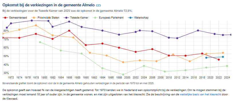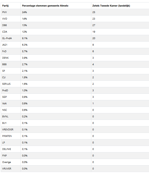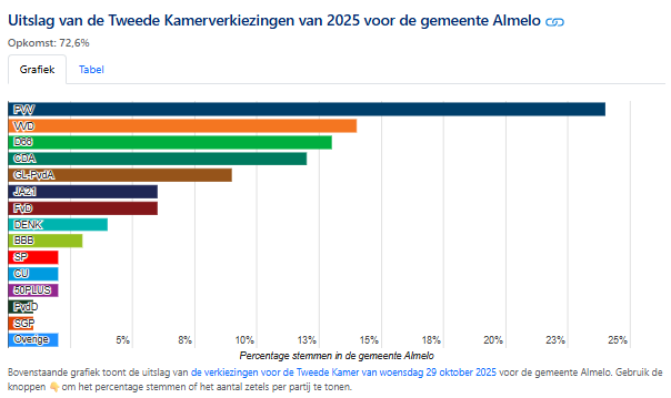 In onderstaande tabel de uitslag van de Tweede Kamerverkiezingen van woensdag 29 oktober voor de gemeente Almelo. De opkomst was 72,6 %. Klik op de grafiek en de tabel voor een vergroting. Bron: allecijfers.nl