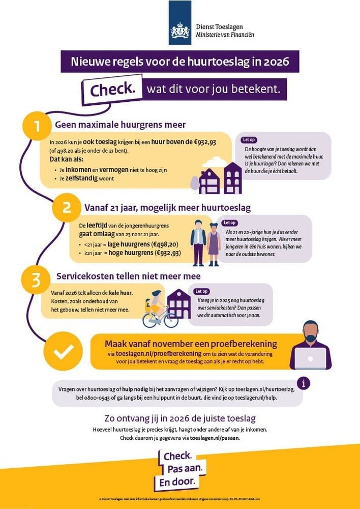 De regels voor de huurtoeslag gaan vanaf donderdag 1 januari 2026 veranderen. Dat kan gevolgen hebben voor iedereen die nu huurtoeslag ontvangt — maar ook voor mensen die het eerder niet kregen. De belangrijkste verandering: er komt geen maximale huurgrens meer.