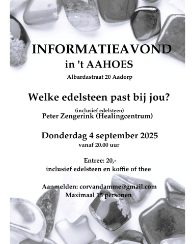 De avond start om 20.00 uur, met inloop vanaf 19.30 uur. De kosten bedragen 20 euro per persoon. Dit is inclusief een edelsteen en koffie of thee.