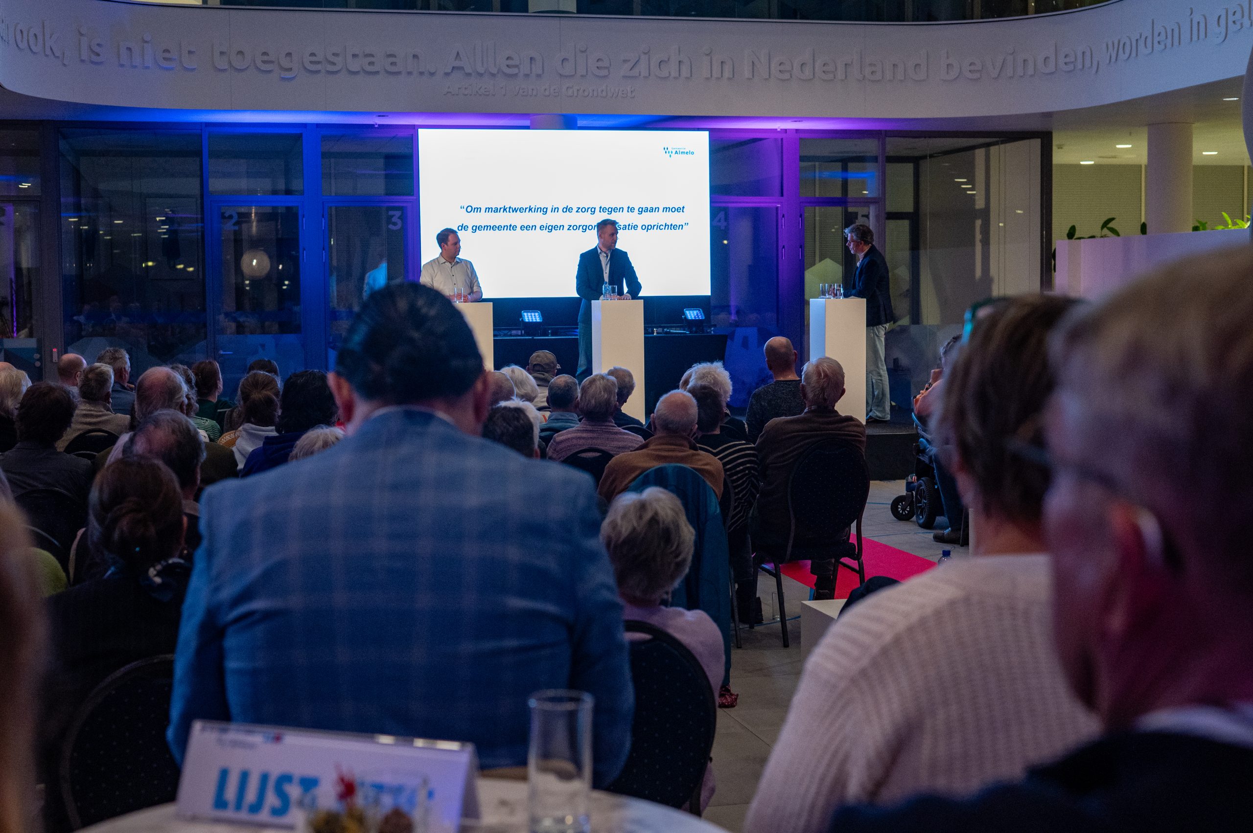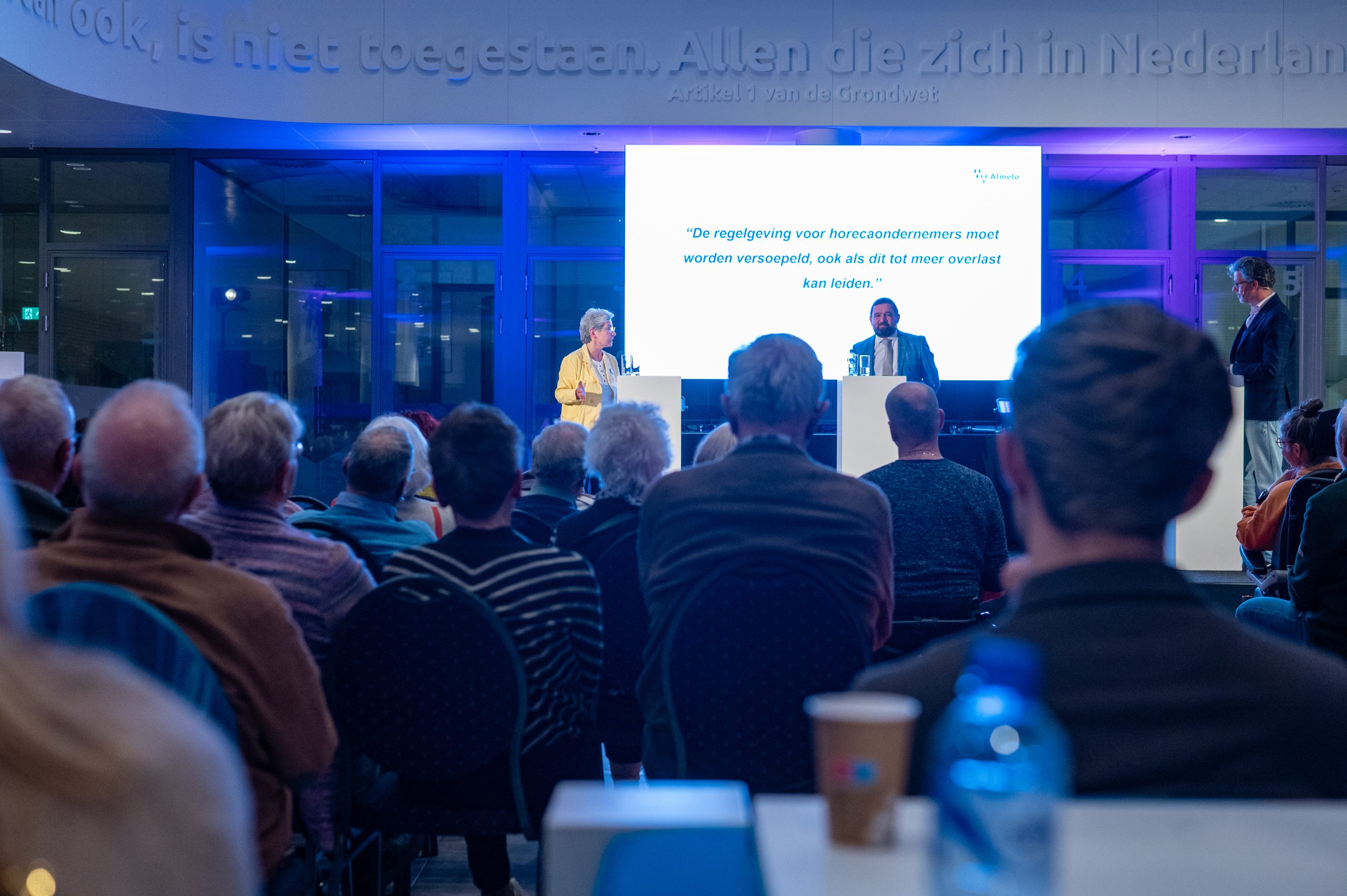 Dijkstra opende de avond met een oproep aan inwoners om te gaan stemmen. Bij de vorige gemeenteraadsverkiezingen lag de opkomst in Almelo op 43,7 procent. “Dat was schandalig laag,” aldus de presentator.