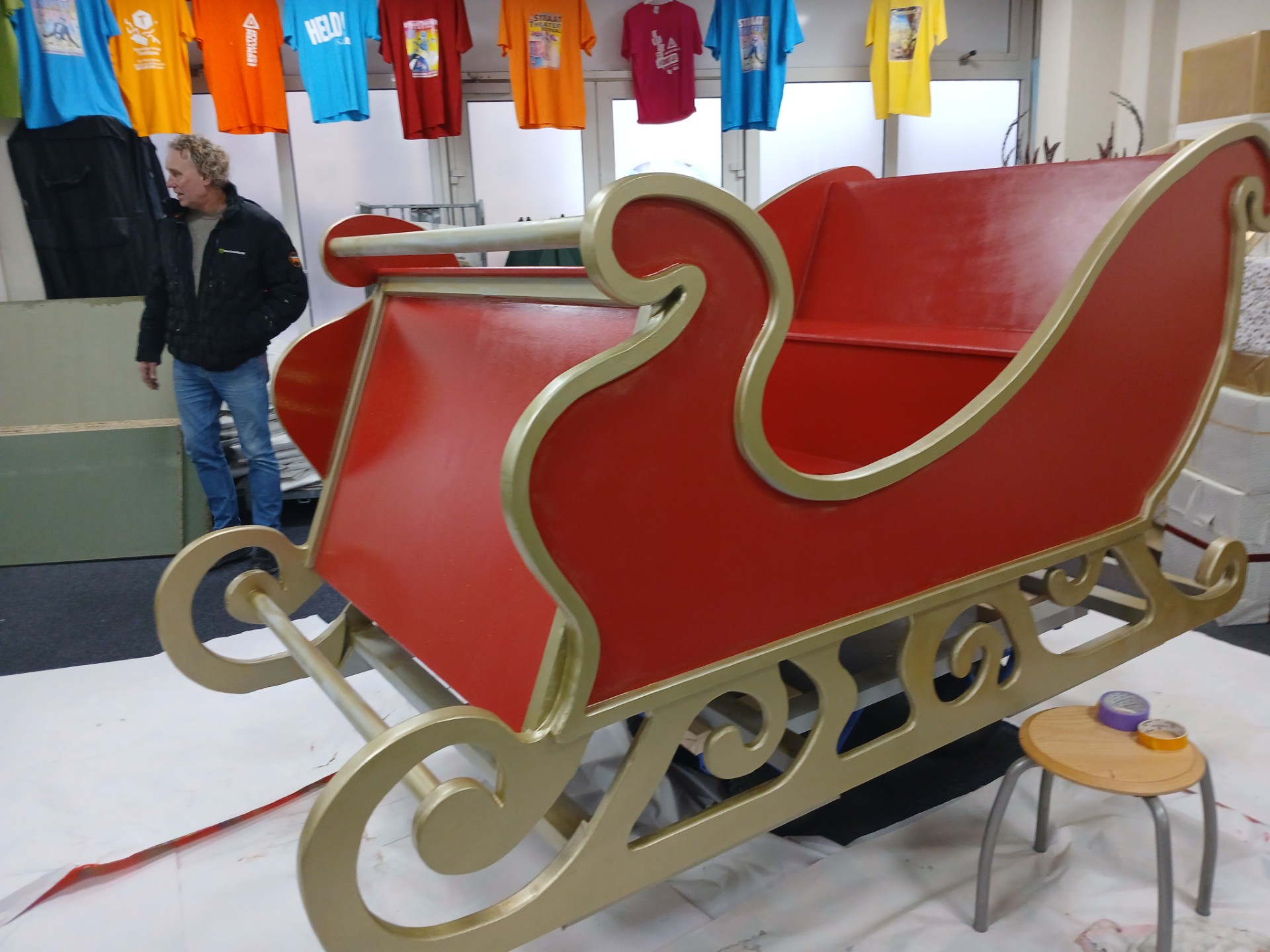 Marc, Frank, Derryl en Ivo werkten de afgelopen weken met volle inzet aan het project — en het resultaat mag er zijn. Op zaterdag en zondag 20 en 21 december rijdt de slee mee op één van de fraai versierde praalwagens door de binnenstad.
