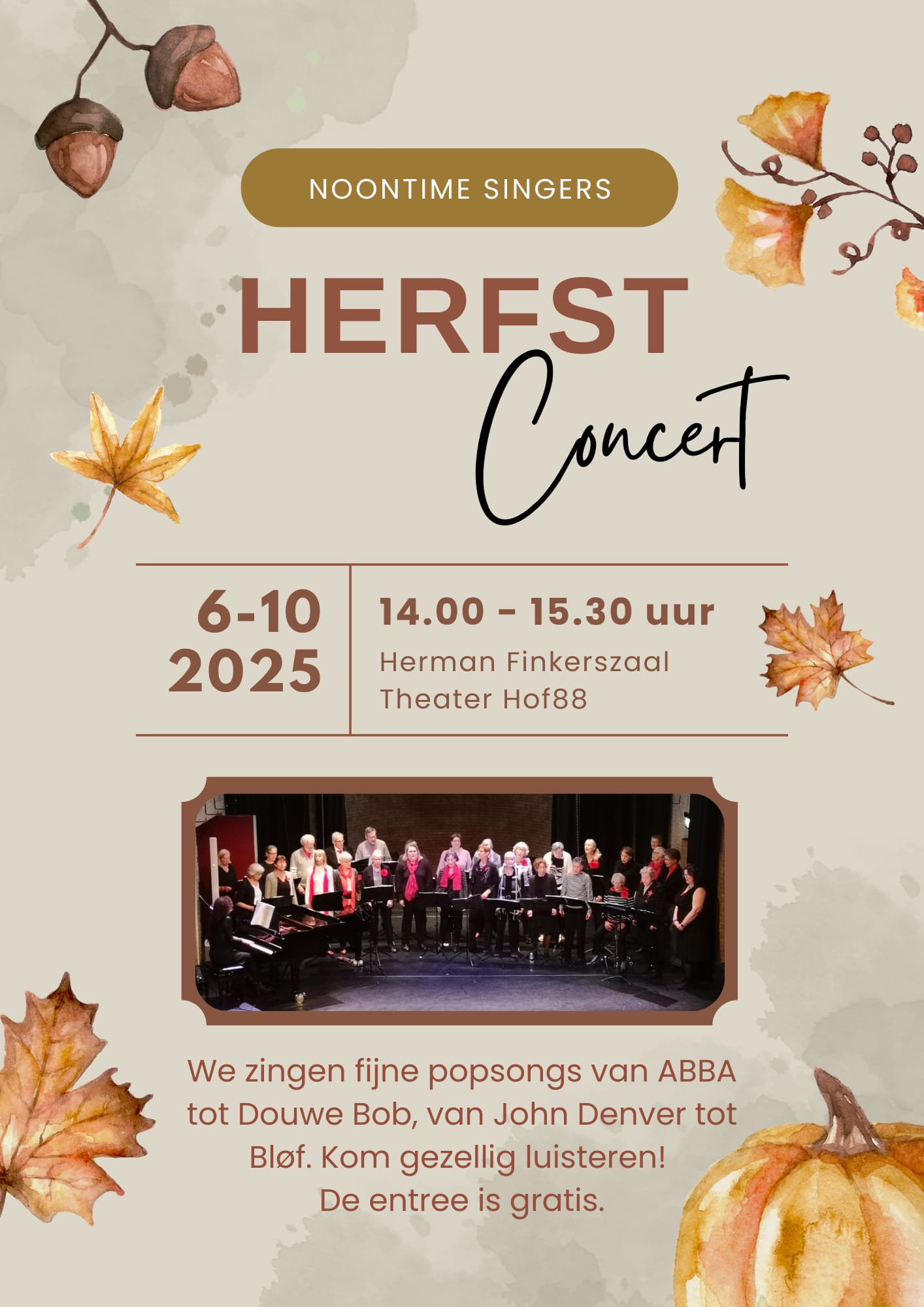 The Noontime Singers, het gemengde popkoor van Kaliber Kunstenschool, verzorgt maandag 6 oktober in de Herman Finkerszaal van Hof 88 een spetterend optreden. Aanvang is 14.00 uur.
