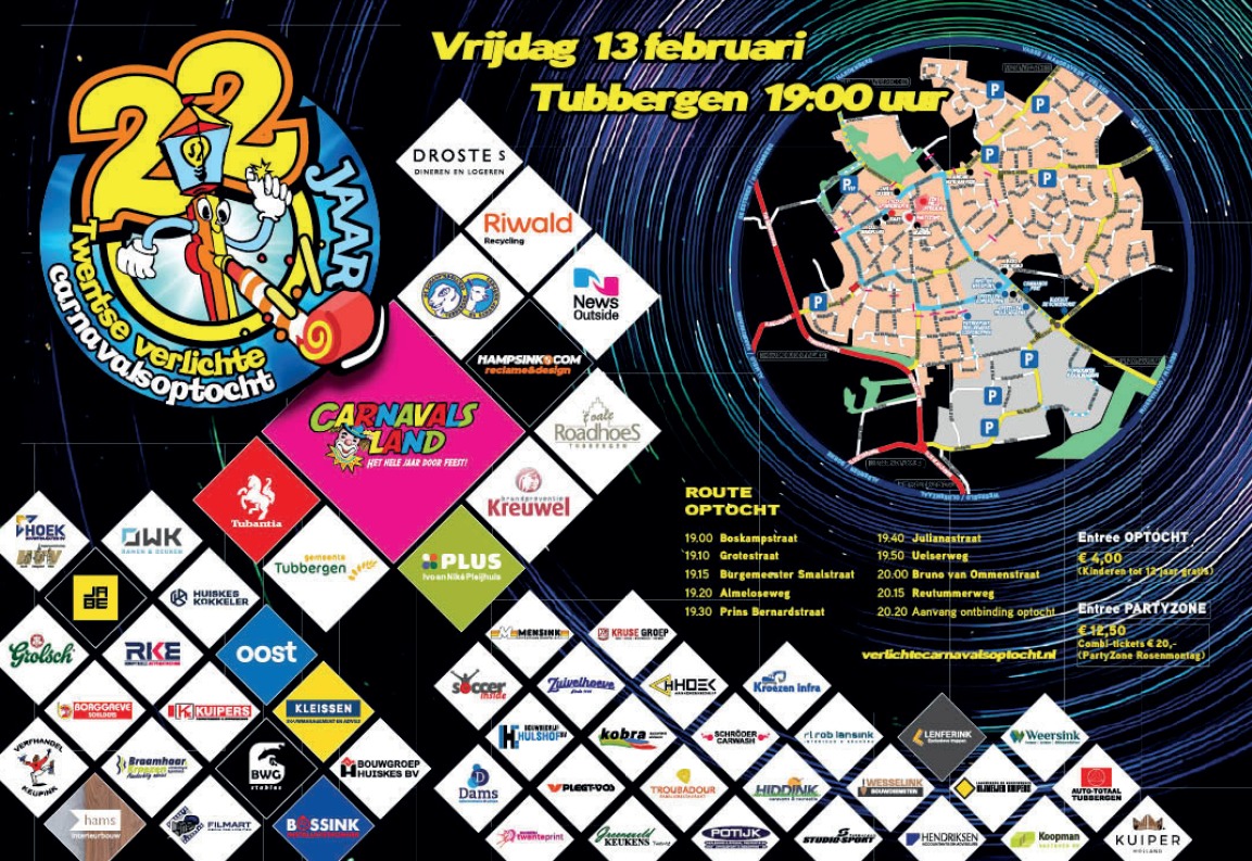 De Twentse Verlichte Carnavalsoptocht is vrijdagavond ook live te volgen via RTV Oost. Na afloop gaat het feest verder in de Partyzone van Tubbergen, met feesttenten op het Raadhuisplein en bij de Delle. In de tent bij de Delle vindt rond 23.00 uur de prijsuitreiking plaats.